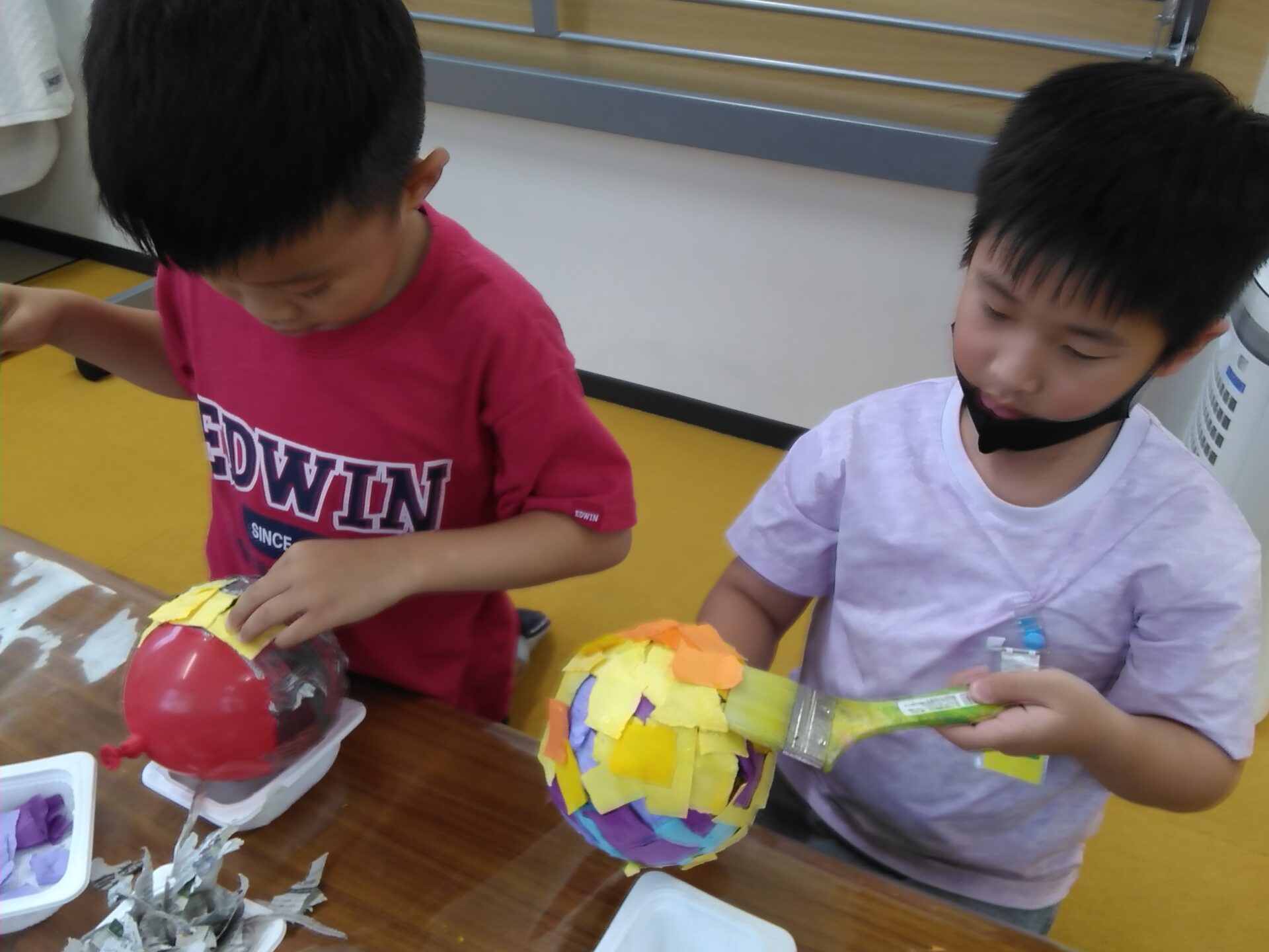 風船🎈に、新聞紙➡画用紙の順に洗濯のりでひたすら貼り付けていきます。