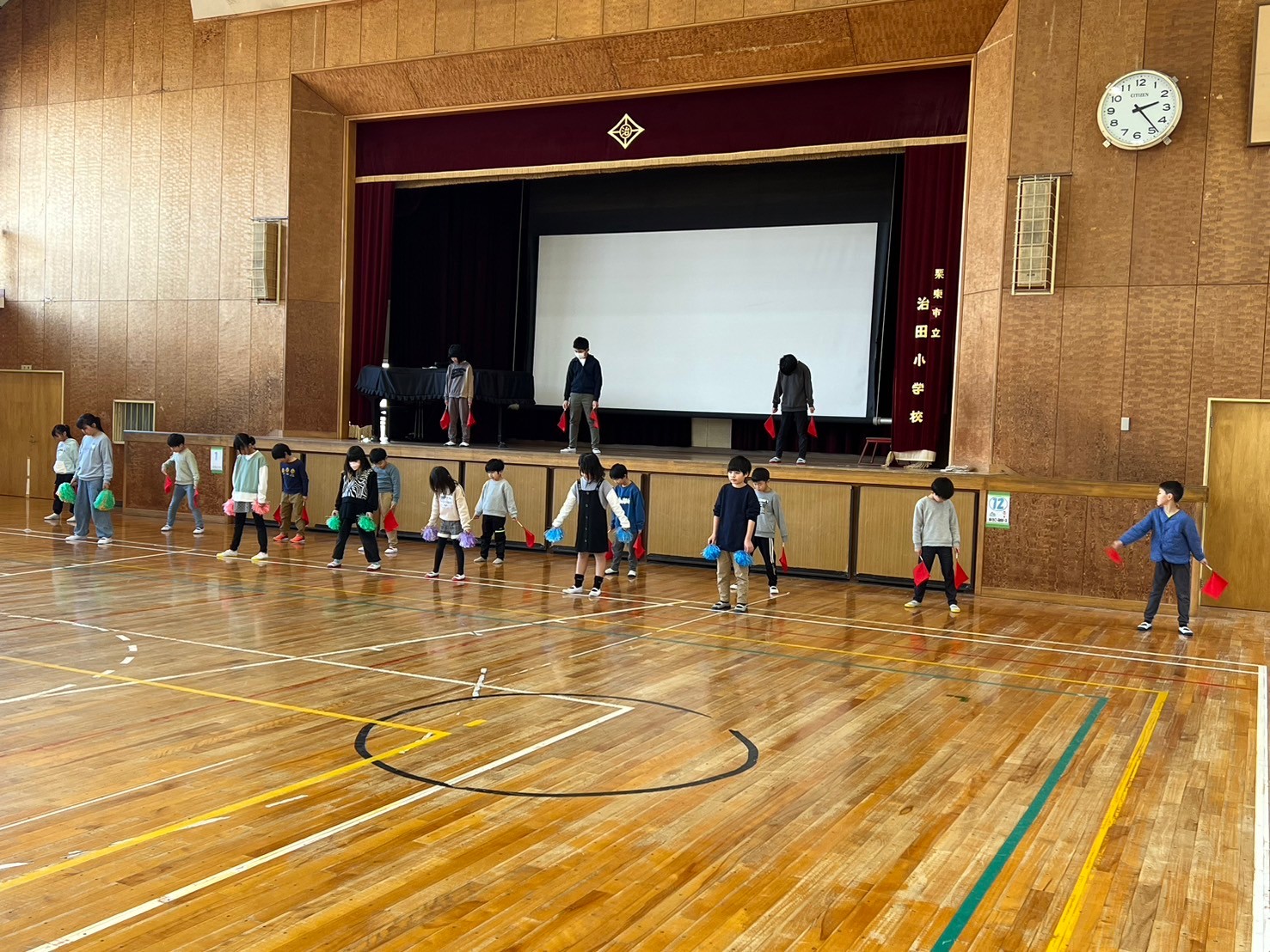 子ども達を集めて、「みんなダンスは完璧だから大丈夫!!今日は笑顔で楽しく踊ろう☺」