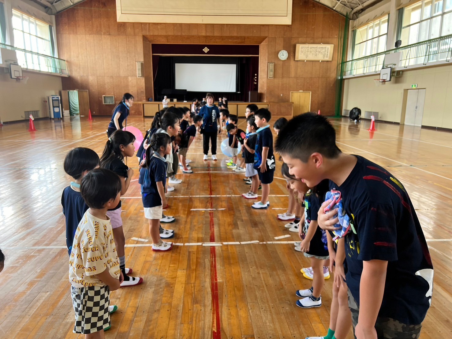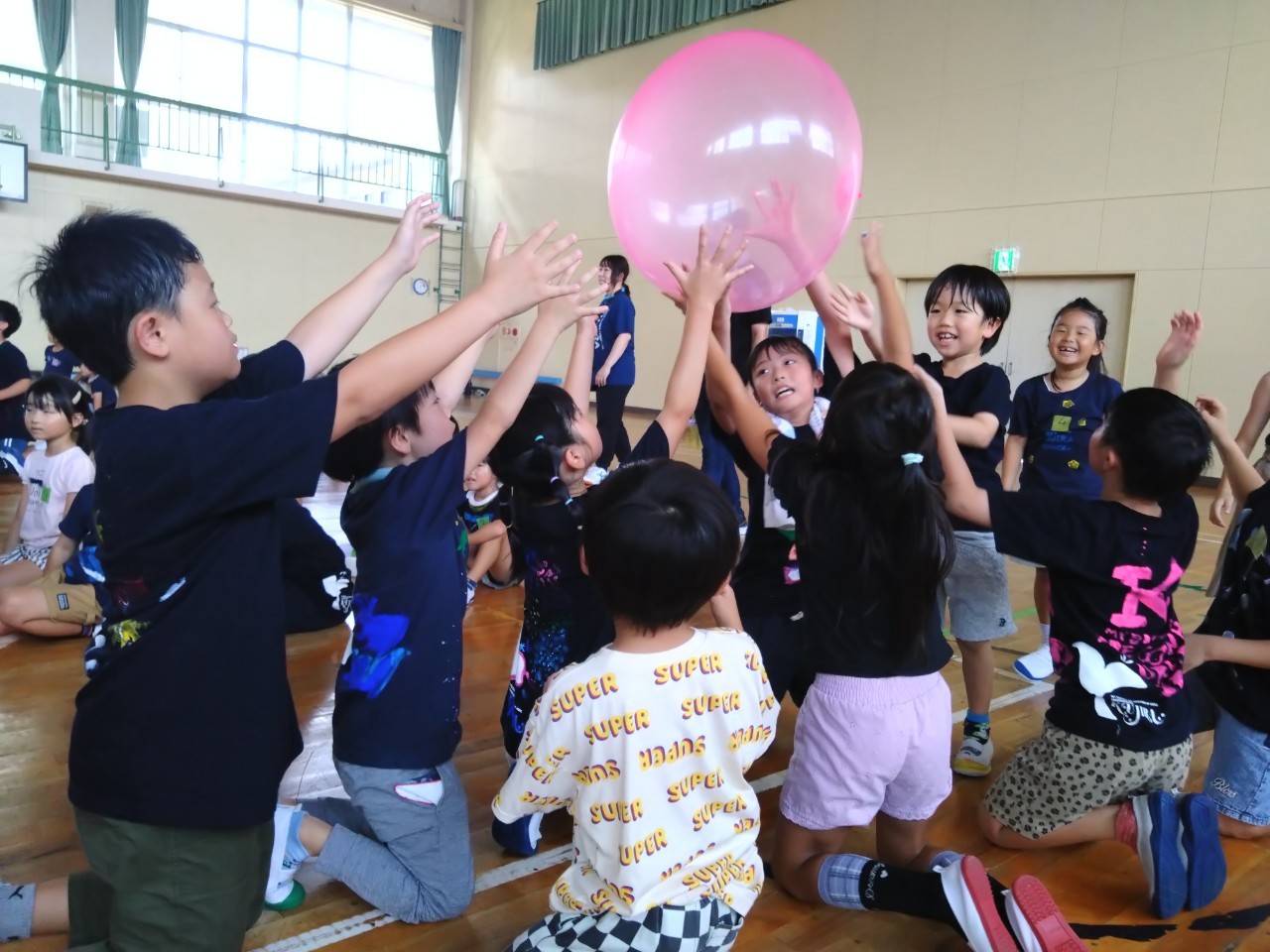 8月22日(木)に治田小学校の体育館を借りて、治田くじら・治田くじらANNEX・葉山くじらの3所合同で『ラジオ体操』『巨大風船転がし』『巨大風船ドッヂ』をしました🥎