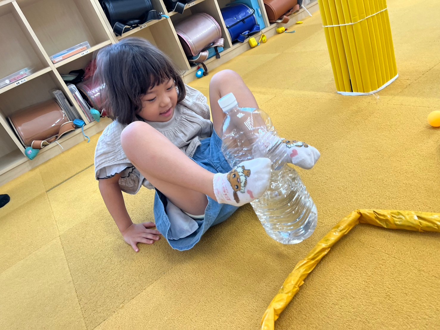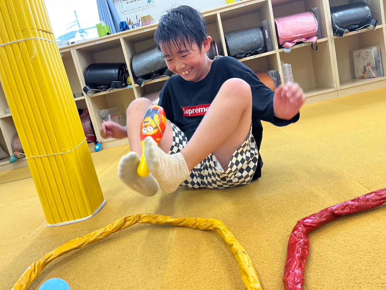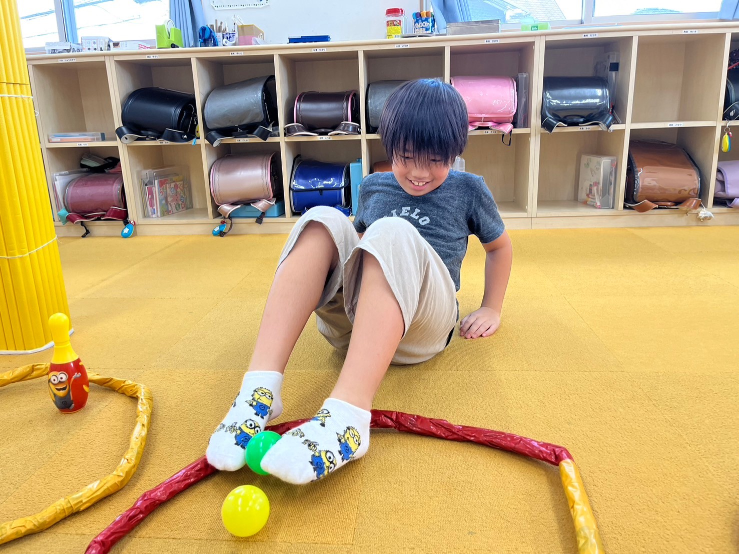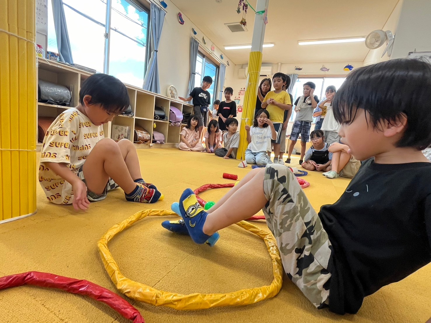 9月11日(水)にみんな遊びとして『足だけ使って障害物リレー』をしました。