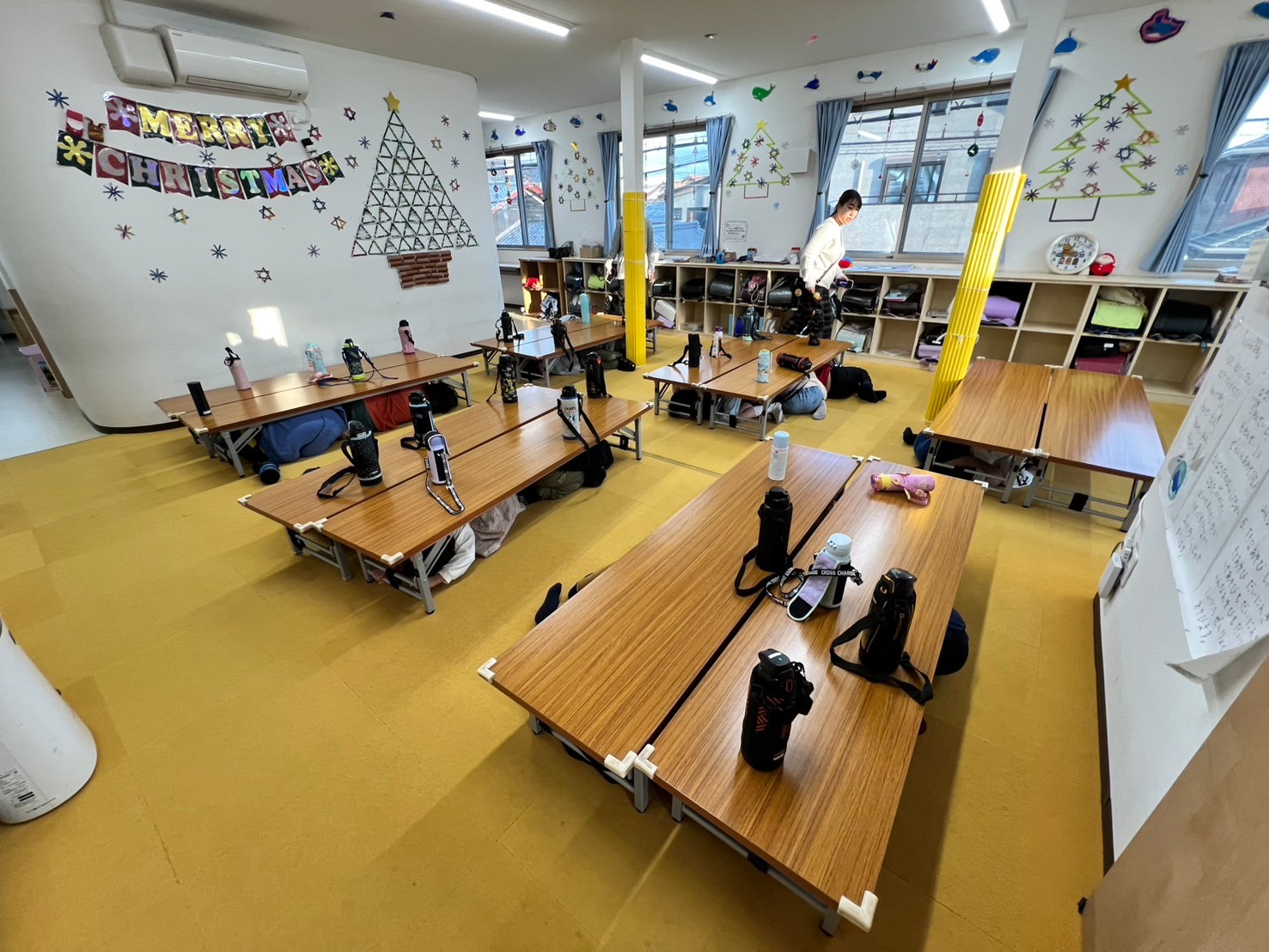 おやつの終盤に、子どもも大人も楽しくお話していると、突然支援員の携帯電話から次々と警報音が鳴りました。
