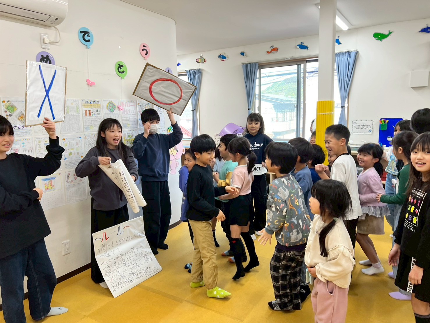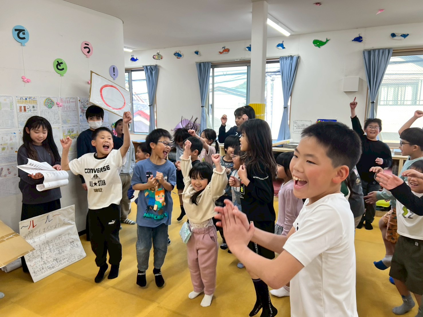 プログラムの最後には、6年生が学童の過ごし方のルールを使って作った、オリジナルの〇✕ゲームをしました。ゲームを楽しみつつ、1年生にもルールを覚えてもらうという、とても良いアイデアに支援員も関心しました。これには全員が参加し、1問正解発表ごとに大盛り上がりで、こちらも楽しむことができました。