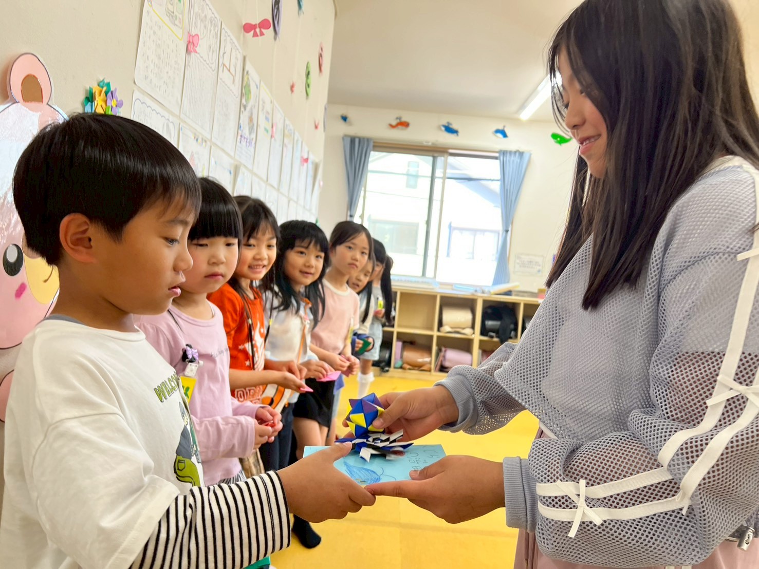 プログラム2つ目は、1年生へのお祝いプレゼントを渡しました。プレゼントをもらう子も渡す子も、少し照れ気味でしたが、みんなが気持ちをこめて作ったプレゼントに、1年生は喜んでいました。