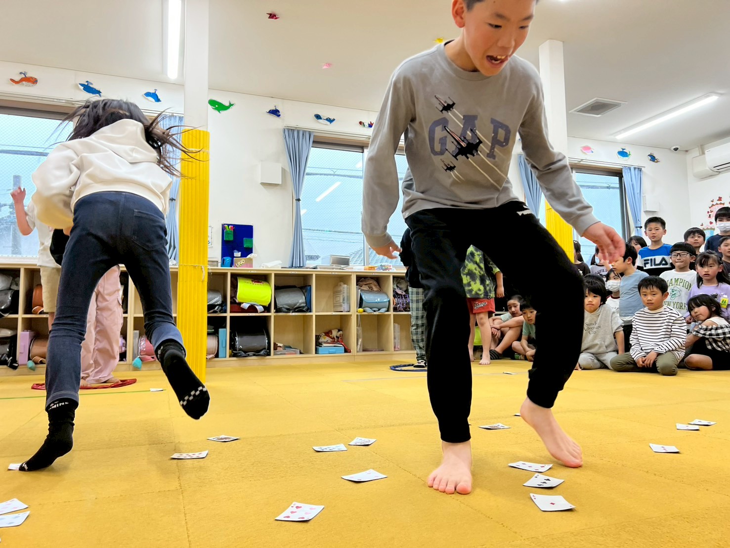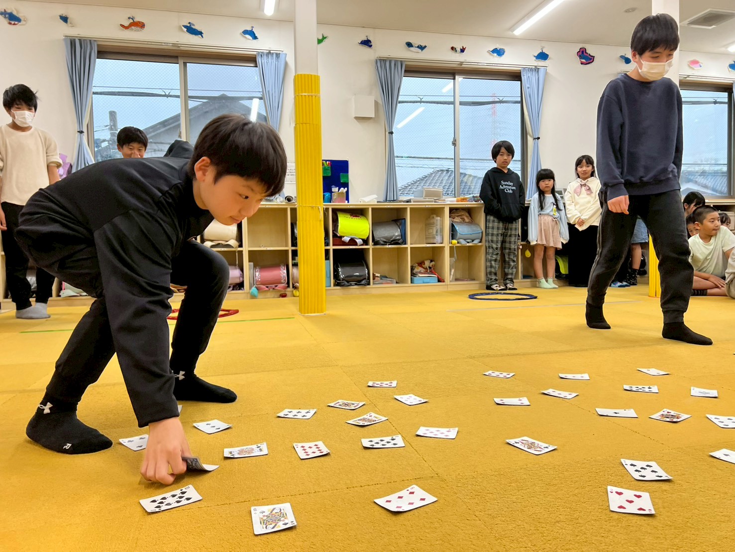 はじめは、1~6年生混合の縦割り班でチームとなり対戦しました。トランプの11~13がわからない子や、マークを間違えて集めてしまう子もいましたが、そこはチームの仲間たちでフォローしあっていました。